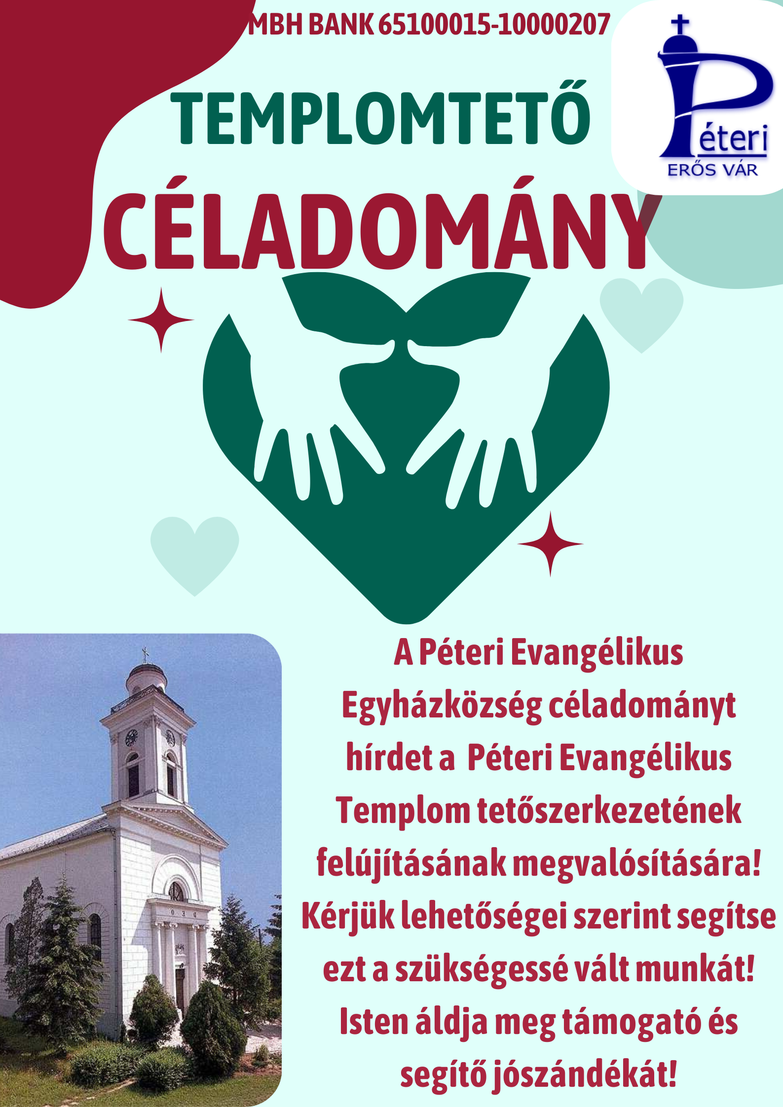 Évek óta ismert probléma, hogy a templomtető szerkezete egyre rosszabb állapotban van, mára pedig egyértelművé vált, hogy elkerülhetetlenné vált részben cseréje, részben felújítása és megerősítése. Hosszú előkészítő folyamatok után az egyházközség két pályázata is pozitív elbírálást kapott, így jelenleg 45 000 000 Ft már rendelkezésre áll, valamint egy egyházi pályázaton további 15 000 000 Ft-ot remélünk. Ez az összeg már reális kiindulás lehet, de még mindig nem fedi a teljes költséget. Próbálunk tehát tovább haladni és még több háttérmunkát beletenni, hogy megvalósulhasson a remélt cél. Ehhez azonban nagy szükségünk lesz az összefogásra, azaz, hogy ki-ki, amivel teheti, segítse a templomtető ügyét. Bármekkora összeg, vagy más irányú felajánlás nagy segítséget jelenthet, így kérjük a közösséget, hogy mutassa meg erejét!